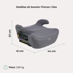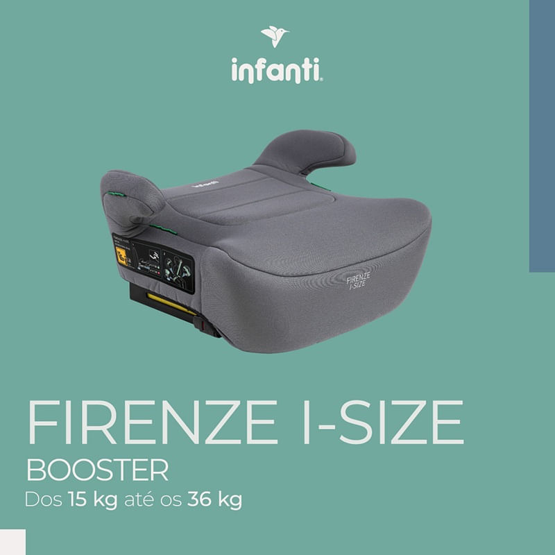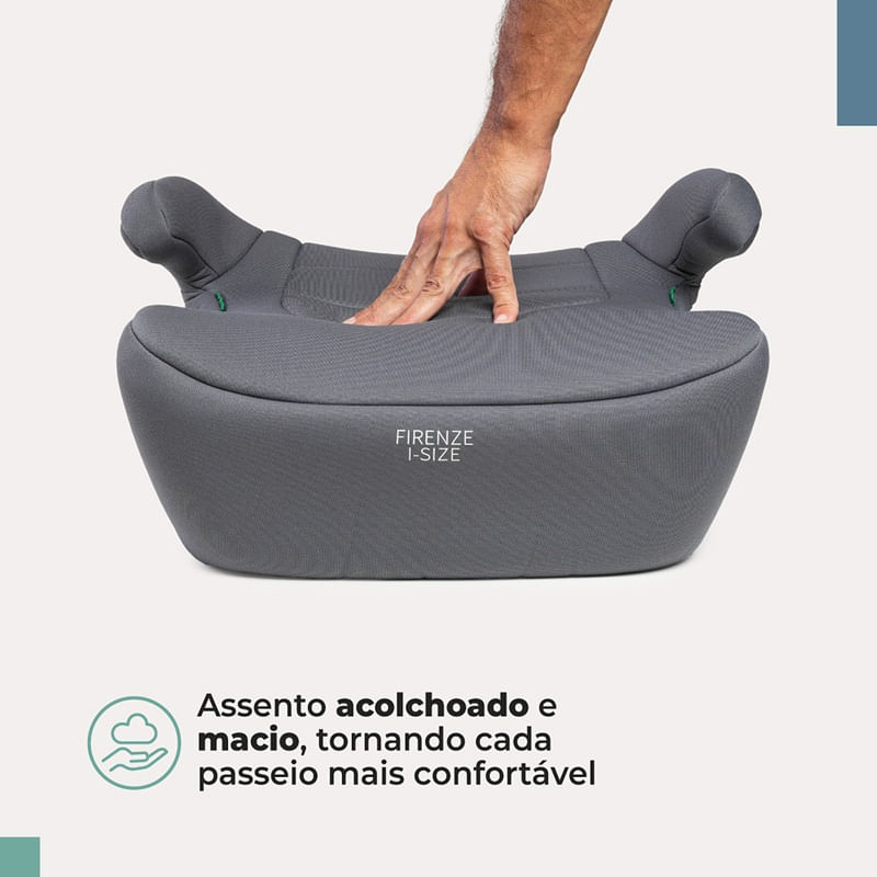 O Firenze i-Size eleva o pequeno a 15 cm, deixando o cinto na posição ideal. Com assento super acolchoado, isofix e apoio de braço, o booster cuida com carinho dos passeios nessa nova fase.