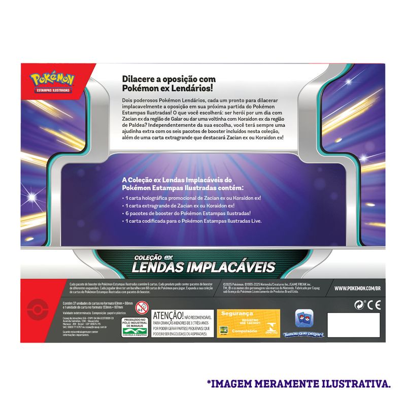 Dois poderosos Pokémon Lendários, cada um pronto para dilacerar implacavelmente a oposição em sua próxima partida do Pokémon Estampas Ilustradas! O que você escolherá: ser herói por um dia com Zacian ex da região de Galar ou dar uma voltinha com Koraidon ex da região de Paldea? Independentemente da sua escolha, você terá sempre uma ajudinha extra com os seis pacotes de booster incluídos nesta coleção, além de uma carta extragrande que destacará Zacian ex"