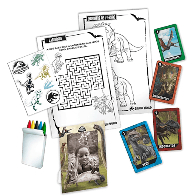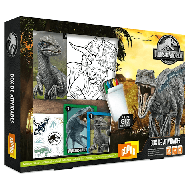 Com mini jogos, o box inclui lâminas com atividades variadas, uma caixa de giz, uma cartela de adesivos, pôster e um porta -retrato de Jurassic World!