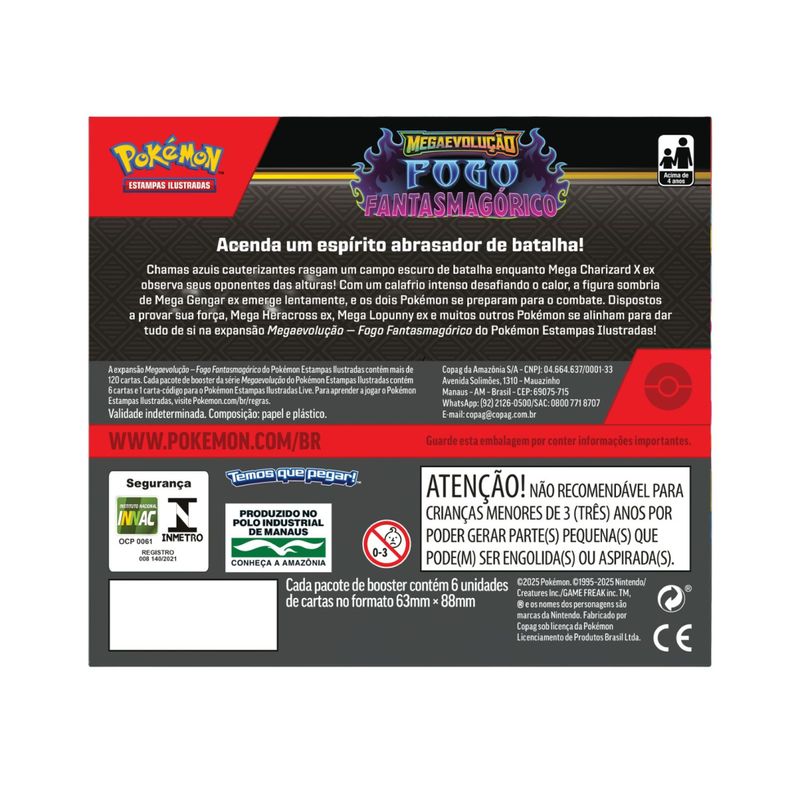 Box Display Megaevolução Fogo Fantasmagórico Marca do produto: Copag. Coleção: Megaevolução - ME02. Conteúdo: - 217 Cartas (36 Boosters com 6 cartas cada e 1 Carta-Código para o Pokémon Estampas Ilustradas Live). Prepare-se para incendiar suas batalhas com a expansão Megaevolução – Fogo Fantasmagórico do Pokémon Estampas Ilustradas! Este box especial destaca poderosos Pokémon em suas formas Mega, incluindo figuras icônicas como Mega Charizard X, Mega Gengar e muitos outros que elevam a disputa a outro nível. Com artes vibrantes e temática flamejante e sombria, esta coleção traz boosters repletos de ação, estratégia e cartas exclusivas para colecionadores e jogadores. Cada booster oferece 6 cartas no formato padrão 63mm x 88mm, permitindo expandir o deck ou iniciar uma jornada no mundo competitivo do TCG. Item lacrado de fábrica.