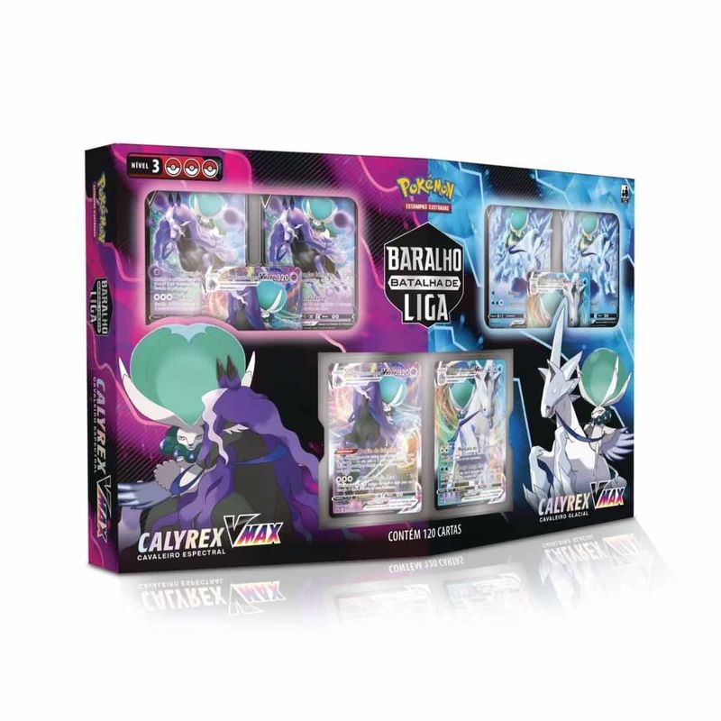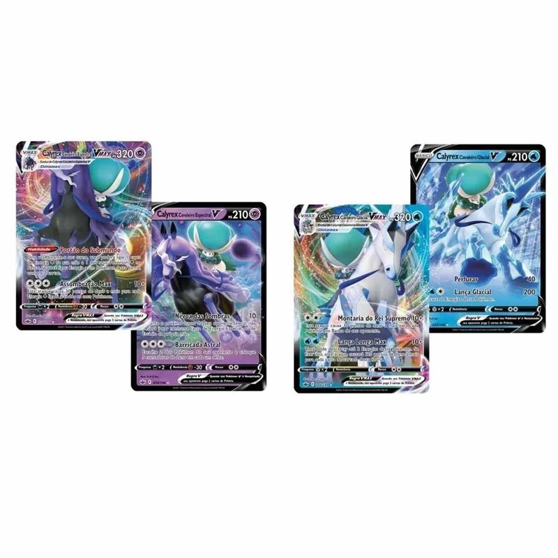 - 2 Baralhos com 60 cartas prontos para jogar (cada baralho é construído com base em um poderoso Pokémon: Calyrex Cavaleiro Glacial Vmax ou Calyrex Cavaleiro Espectral Vmax)