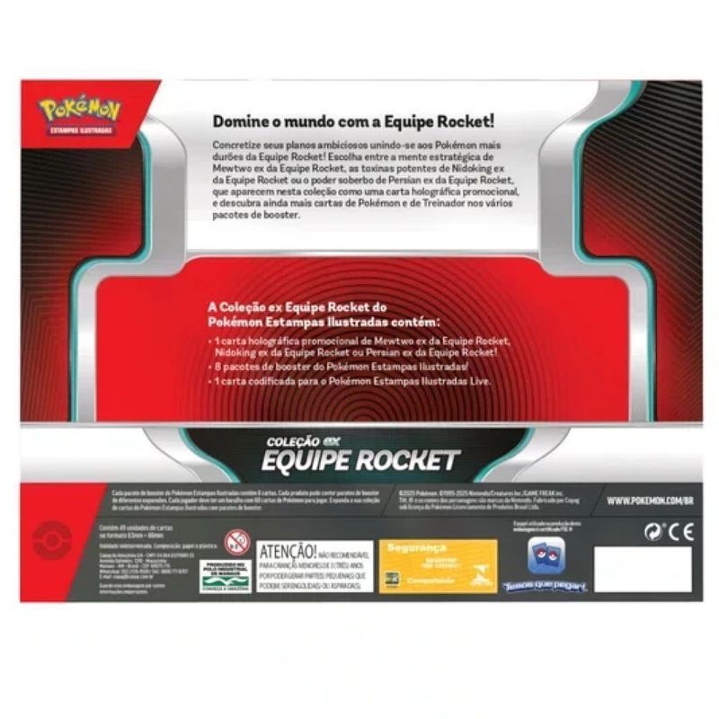 Escolha entre a mente estratégica de Mewtwo ex da Equipe Rocket, as toxinas potentes de Nidoking ex da Equipe Rocket ou o poder sombrio de Persian ex da Equipe Rocket, que aparecem nesta coleção como uma carta holográfica promocional, e descubra ainda mais cartas de Pokémon e de Treinador nos vários pacotes de booster.