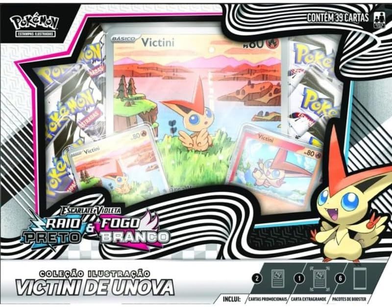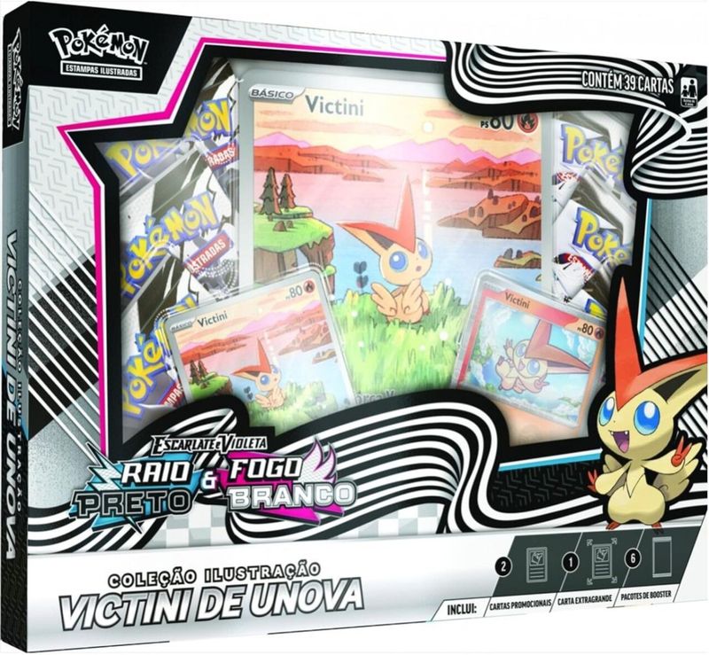 -Nesta coleção, você vai receber uma promocional com ilustração rara, uma carta holográfica paralela carta holográfica premium de Victini e uma carta extragrande. Você também vai encontrar ainda mais Pokémon da região de Unova nos pacotes de booster das expansões!