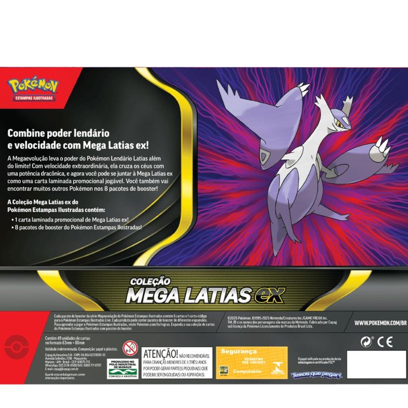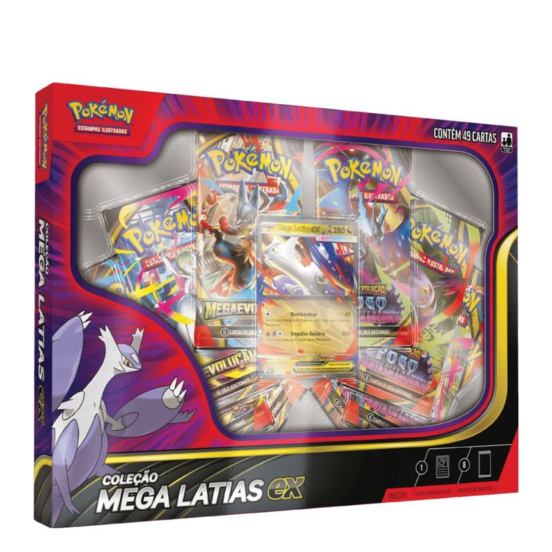 Nesta caixa, você terá a oportunidade de se juntar à Mega Latias EX através de uma carta laminada promocional jogável, ideal para fortalecer seu deck e colecionar Pokémon poderosos. Além disso, a caixa inclui 8 pacotes de booster, oferecendo a chance de encontrar outros Pokémon impressionantes e expandir sua coleção.
