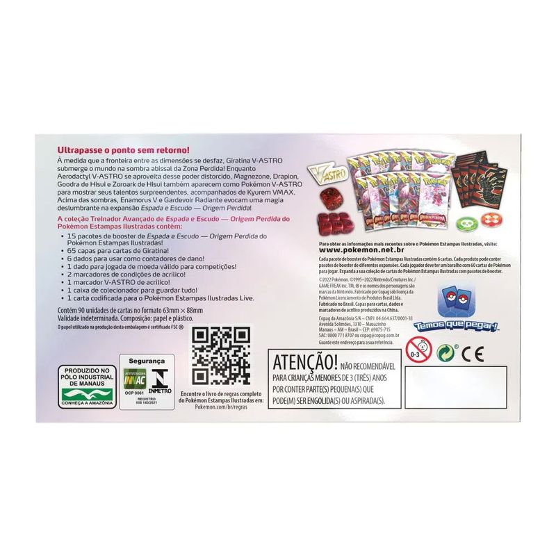 Á medida que a fronteira entre as dimensões se desfaz, Giratina V-ASTRO submerge o mundo na sombra abissal da Zona Perdida! Enquanto Aerodactyl V-ASTRO se aproveita desse poder distorcido, Magnezone, Drapion, Goodra de Hisui e Zoroark de Hisui tambem aparecem como Pokemon V-ASTRO para mostrar seus talentos surpreendentes, acompanhados de Kyurem VMAX. Acima das sombras,Enamorus V e Gardevoir Radiante evocam uma magia deslumbrante na expansão Espada e Escudo - Origem Perdidas!