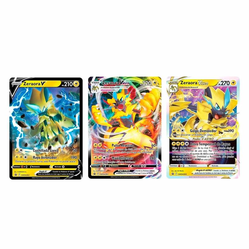 Zeraora, o Pokémon Trovoada, cruza o campo de batalha em disparada, desferindo uma tempestade e tanto como um trio de Pokémon V! Evolua Zeraora V para combater a estratégia do seu oponente usando os ataques poderosos de Zeraora VMAX ou o Poder V-ASTRO relampejante de Zeraora V-ASTRO.