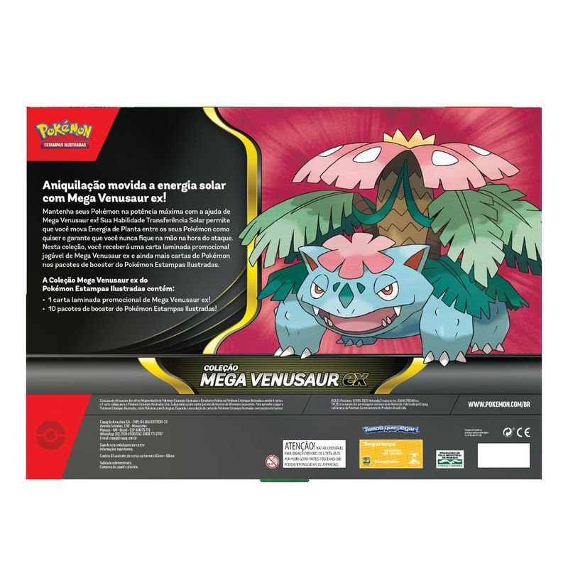 Aniquilação movida a energia solar com Mega Venusaur ex! Mantenha seus Pokémon na potência máxima com a ajuda de Mega Venusaur ex! Sua Habilidade Transferência Solar permite que você mova Energia de Planta entre os seus Pokémon como quiser e garante que você nunca fique na mão na hora do ataque. Nesta coleção, você receberá uma carta laminada promocional jogável de Mega Venusaur ex e ainda mais cartas de Pokémon nos pacotes de booster do Pokémon Estampas Ilustradas. A Coleção Mega Venusaur ex do Pokémon Estampas Ilustradas contém: • 1 carta laminada promocional de Mega Venusaur ex! • 10 pacotes de booster do Pokémon Estampas Ilustradas!