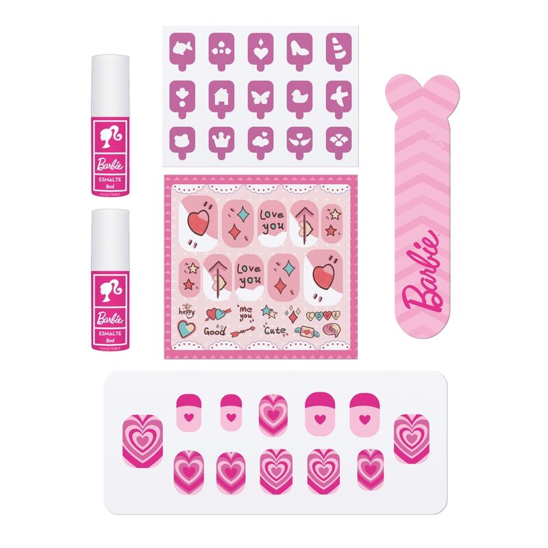 Transforme qualquer momento em um dia de beleza com a Esmalteria Duo Barbie! Com um design super fashion e cores vibrantes, ela traz tudo o que as pequenas fashionistas precisam para criar unhas incríveis. Certificada pela Anvisa e desenvolvida com total segurança, é a combinação perfeita de diversão e cuidado! O kit contém 2 cores de esmalte (vermelho e roxo), 15 estêncil adesivos para unhas, 22 adesivos para unhas, 14 unhas artificiais, 24 fitas adesivas dupla face para unhas e 1 lixa de unhas. Perfeita para deixar as unhas tão estilosas quanto as da Barbie!