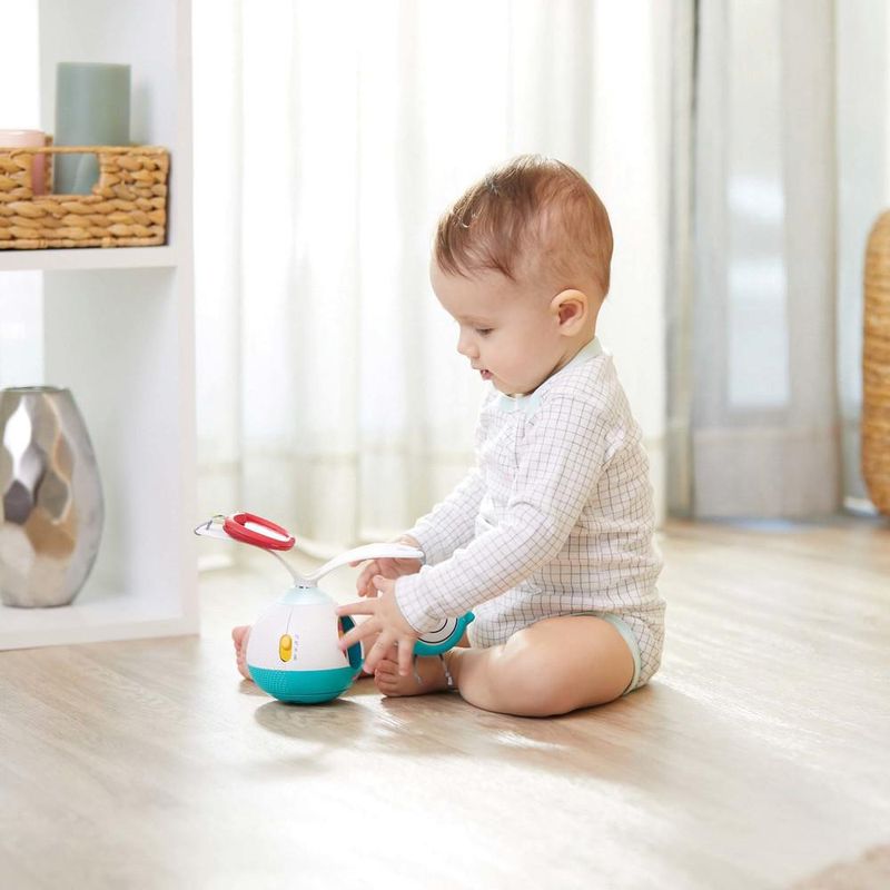Giratório em 360º, com músicas e luzes que fascinam e prendem a atenção do bebê por