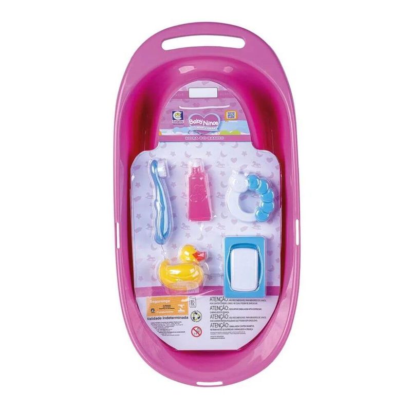 Conteúdo da embalagem: 1 banheira, 1 pasta, 1 escova de dente, 1 saboneteira com sabonete, 1 patinho e 1 chocalho
