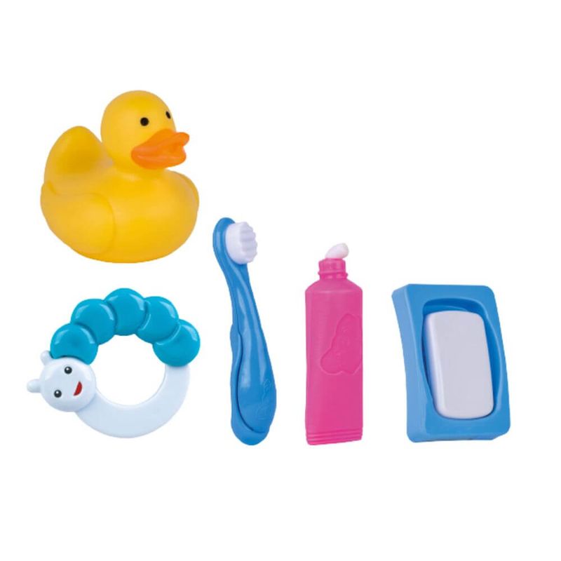 O kit hora do banho vem com uma banheira, uma pasta e uma escova de dente, uma saboneteira com sabonete, um patinho e um chocalho.
