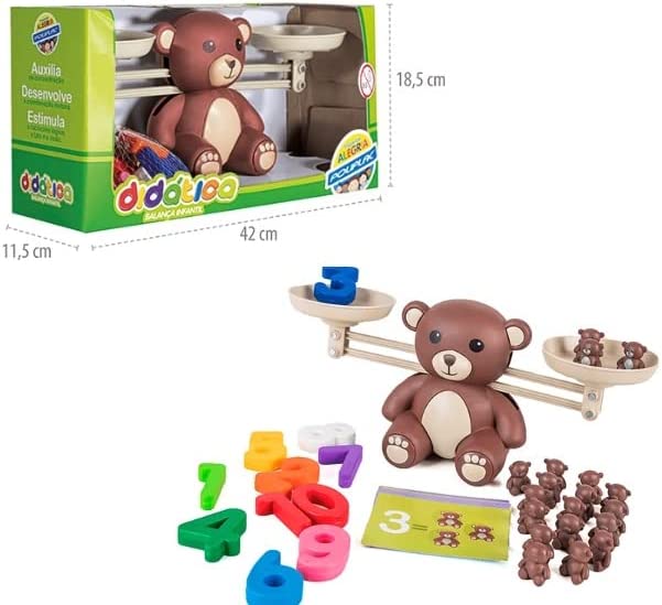 É composta por uma balança, 10 números, 20 ursinhos e 20 cartelas diferentes de somas.