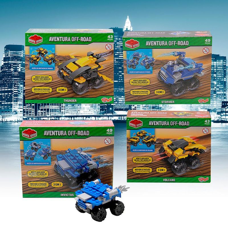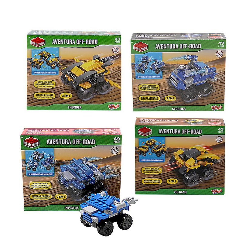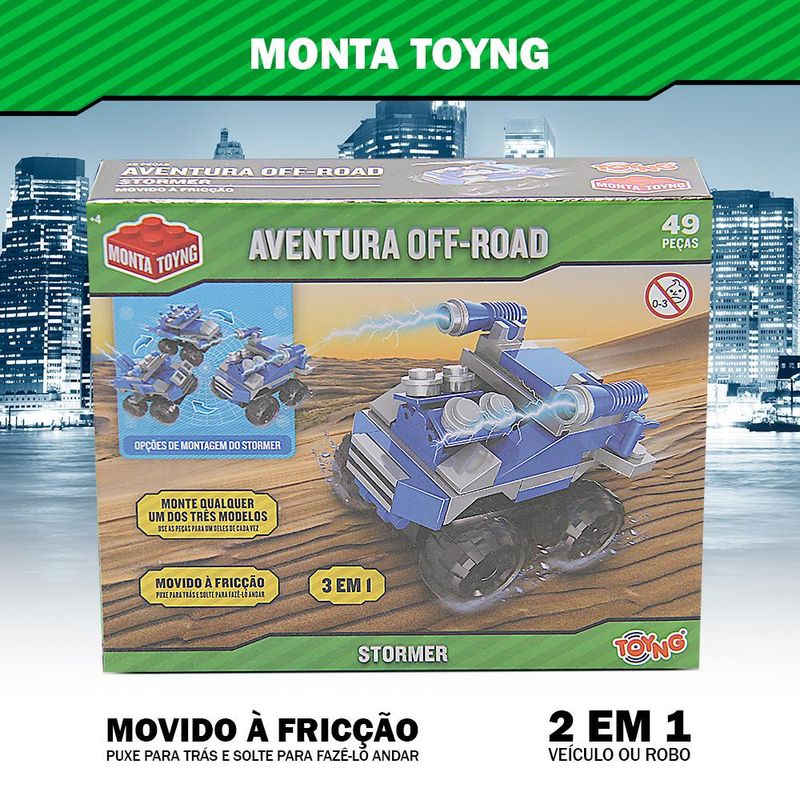 Você já imaginou como seria montar seu próprio carrinho de aventuras? Com o carrinho aventura off-road, seu filho não apenas brinca, ele cria, com 49 peças e 3 opções diferentes de montagem, o carrinho é uma experiência completa que mistura diversão, aprendizado e muita ação. Feito para crianças acima de 4 anos, vai além de uma simples brincadeira - ele ensina conceitos básicos de engenharia, desenvolve a coordenação motora e a criatividade. Além disso, é movido à fricção, sem necessidade de baterias, ele corre pela casa com apenas um toque, garantindo horas de diversão sem parar. O carrinho é fabricado com material de qualidade, certificado e seguro para crianças, sem peças que representem riscos. A montagem é feita de forma simples, e o brinquedo é resistente. Além de muita diversão, seu filho vai desenvolver habilidades de coordenação motora, raciocínio lógico e aprender noções básicas de como montar estruturas, trabalhando também a paciência e concentração. Movido à fricção, ou seja, é só puxar, soltar e ver ele correr. Nada de baterias ou recargas, garantindo diversão sem interrupções. Material: ABS INMETRO: 002000/2021 Indicação: + 4 anos de idade Composição: 49 peças