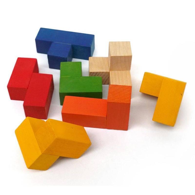 Cubo mosaico componível em madeira colorida com 7 peças.