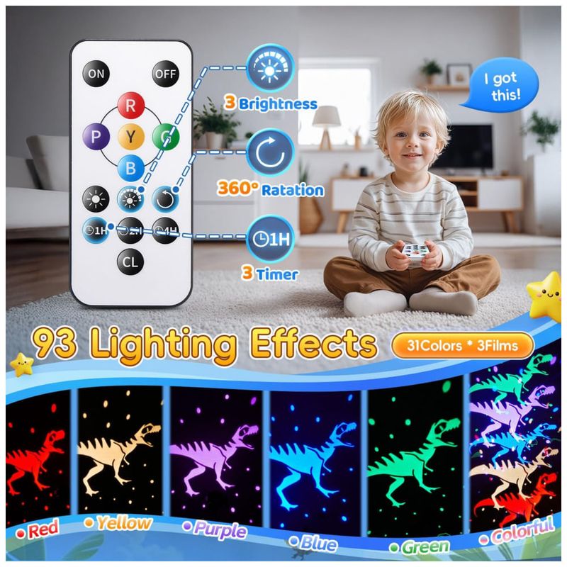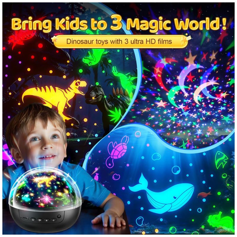O Brinquedo de Dinossauro para Crianças da marca Staryou é uma escolha indispensável, com projeção de 3 filmes, 93 efeitos, controle remoto, temporizador e 3 níveis de luminosidade. Quando combinado com os filmes de dinossauro, ele se transforma em 3 incríveis brinquedos em 1! Com 5 cores e 31 efeitos fascinantes, este brinquedo garantirá horas de diversão. Além disso, possui rotação silenciosa de 360 graus, proporcionando um efeito universo giratório. Embalado em uma caixa requintada, este brinquedo é o presente perfeito para meninos de 3 anos!