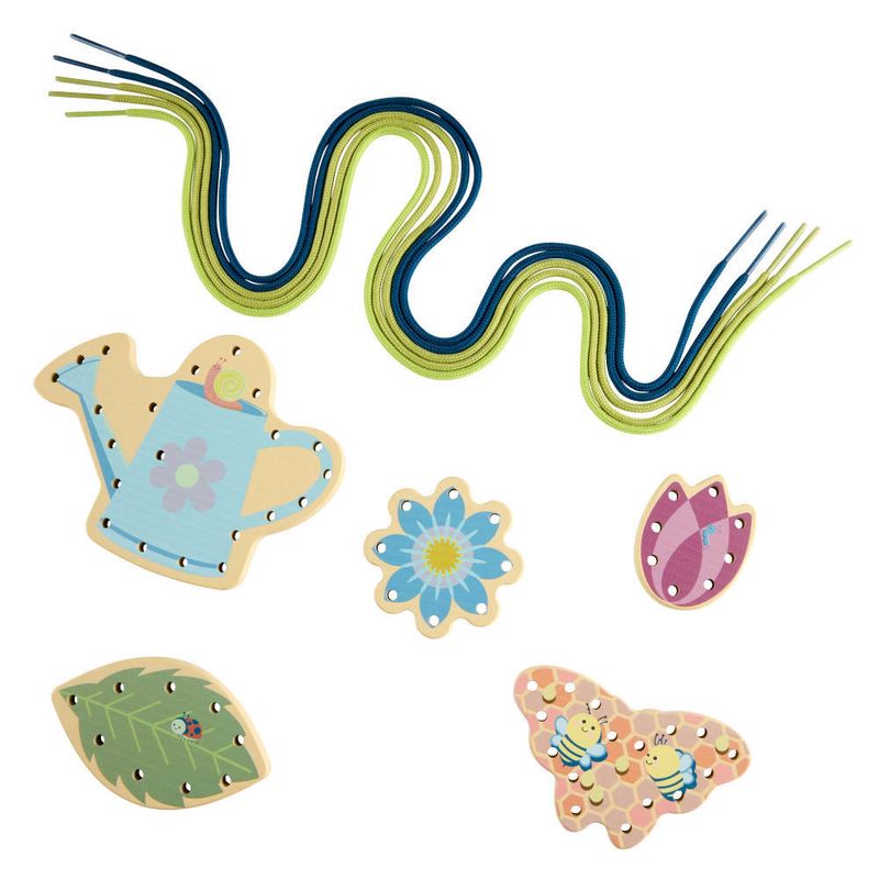 Os meninos podem desenvolver suas habilidades motoras finas por meio de atividades criativas de amarrar e traçar com o conjunto Wooden Lacing Garden da Fisher-Price. Os meninos podem passar os cordões coloridos pelos cartões de madeira com dupla face e "costurá-los" juntos para criar seu próprio jardim. Fabricado com madeira proveniente de fontes certificadas pelo FSC® (FSC-N004566) e decorado com tinta não tóxica à base de água, este conjunto temático de jardim incentiva a criatividade enquanto fortalece a destreza e a coordenação olho-mão. As cores e as decorações podem variar.