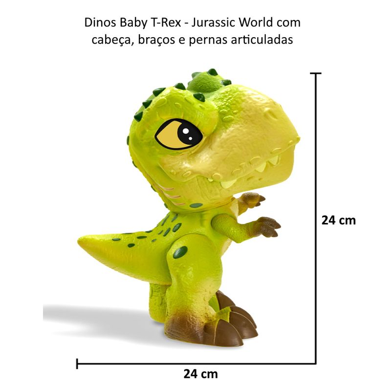 Prepare-se para ação e aventuras emocionantes com os Jurassic World™ Dinos Baby. Com seus olhos realistas e design diferenciado é ferozmente adorável. Possui articulação no pescoço, ombro e nos pés para melhores possibilidades de poses. As crianças podem dar vida a diversas aventuras com o Tiranossauro Rex Jurassic World Dinos Baby.