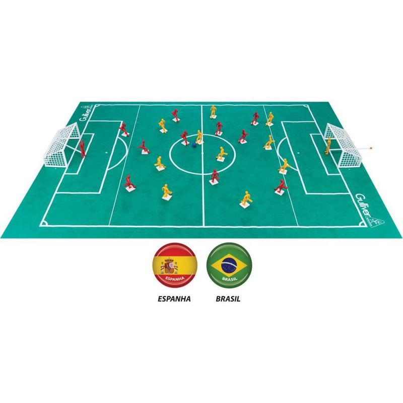 Jogo Futebol Club Gulliver Seleções Copa do Mundo, Brasil x Espanha Jogadores Coloridos com pernas articuladas que chutam de verdade, Goleiros com hastes para grandes defesas! As chuteiras contém 4 formatos incríveis! A caixa contém duas Seleções de 11 jogadores cada, 2 hastes para mover os Goleiros, 2 traves para montar, 2 bolas, 1 campo em TNT e adesivos. Jogo incrível para se divertir com seus amigos.
