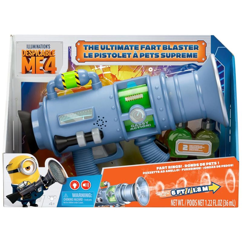 Inspirado nos adoráveis Minions de "Meu Malvado Favorito 4", o Ultimate Fart Blaster é adequado para crianças maiores de 4 anos e vem com duas fórmulas de peido com aromas diferentes que podem ser carregadas no blaster.