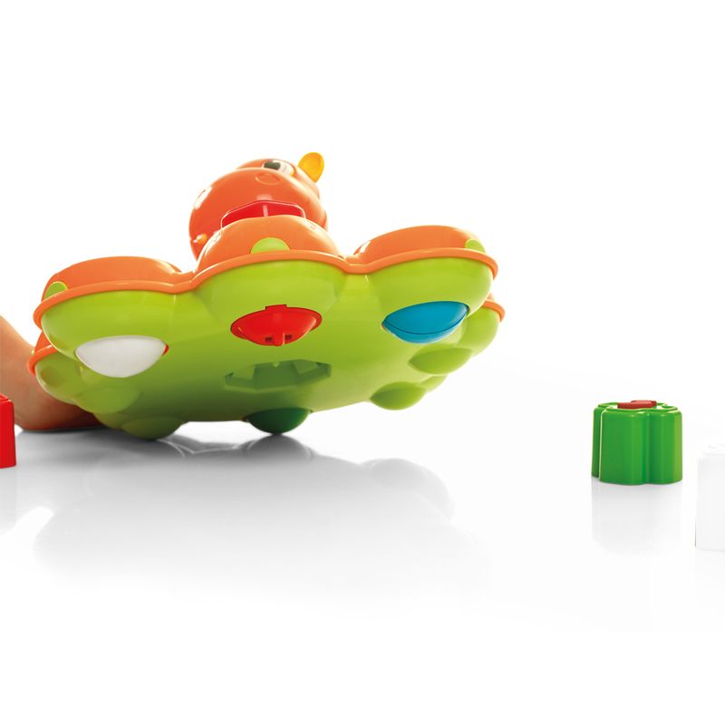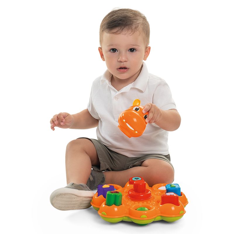 Nessa hora os blocos saltam pra fora do brinquedo! E para soar a melodia, é só apertar a estrelinha que se encontra na frente da cabecinha do animal.