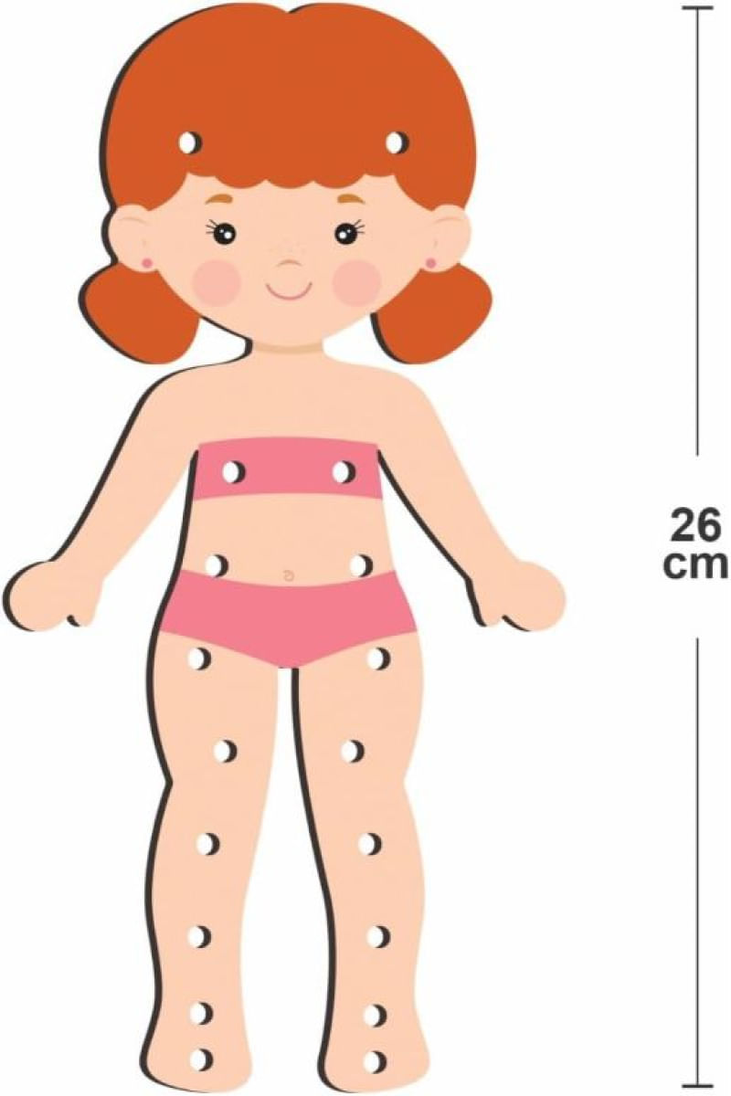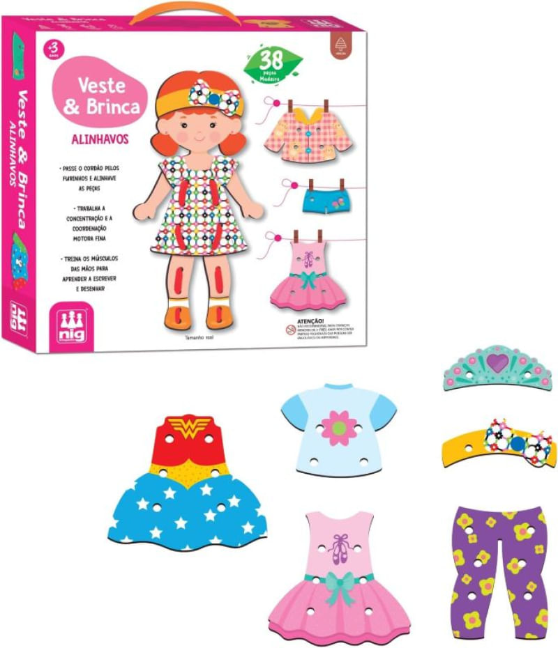 Veste e Brinca da Nig é uma atividade Montessori contendo um kit com 01 boneca de 26cm e 37 pecinhas com lindas roupinhas e acessórios, tudo em madeira. O Box acompanha 06 cadarços coloridos para prender as peças.