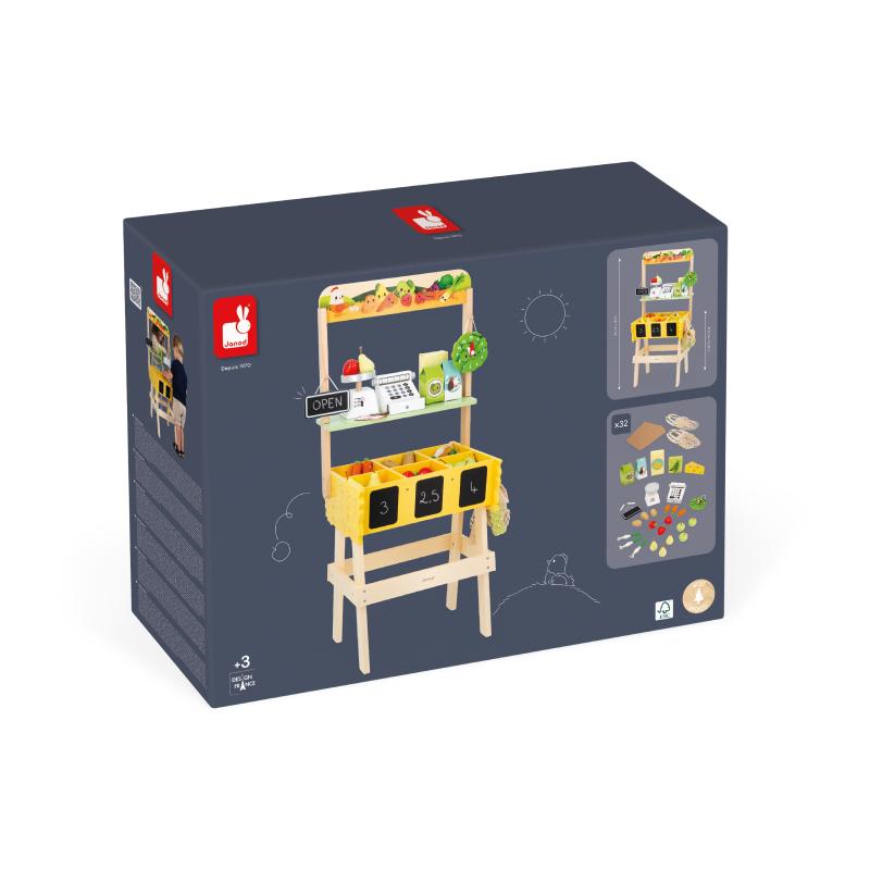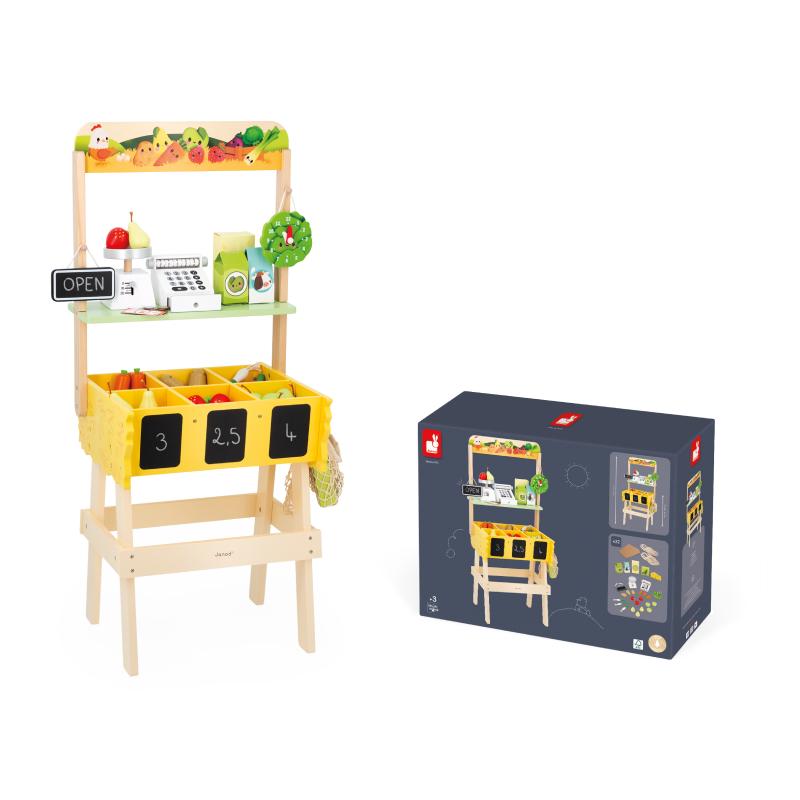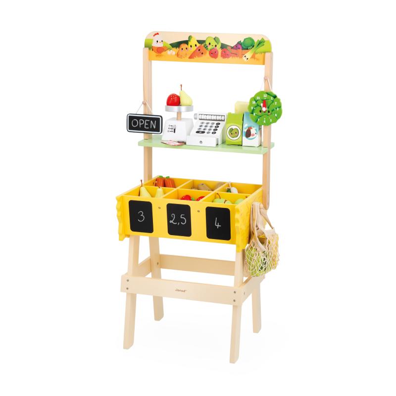 Brinquedo indicado para crianças a partir de 3 anos de idade. Um total de 58 acessórios completam este mercado infantil: frutas e vegetais (3 cenouras, 3 batatas, 3 alhos-porós, 3 morangos, 3 maçãs e 3 peras), 5 produtos embalados (ervilhas, farinha, leite, suco de maçã e queijo), 1 relógio, 1 balança, 1 caixa registradora com 9 notas e 12 moedas, 1 quadro-negro com 2 gizes, 6 sacolas de papel para embalar frutas e vegetais e 2 redes de tecido. Nos 6 compartimentos desta mercearia de madeira. Cada compartimento vem com um quadro negro no qual o preço de cada item pode ser escrito. Desenvolve habilidades sociais e cognitivas, além de sua imaginação e vocabulário. Feito de madeira com certificação FSC™