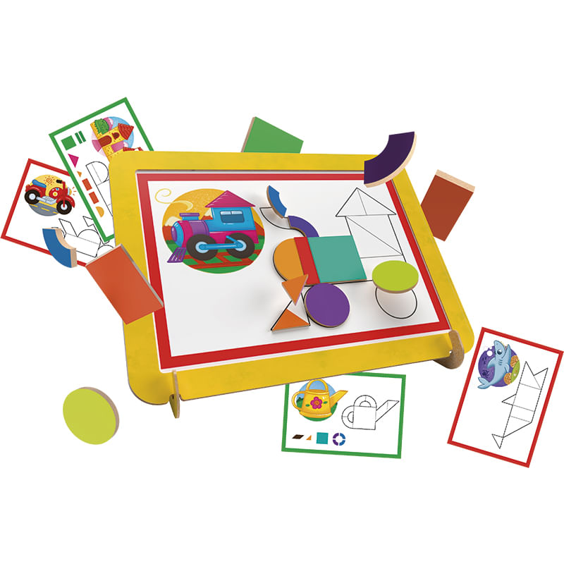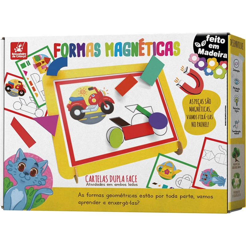 Uma atividade divertida com 24 peças magnéticas de diversas cores e com silhuetas de formas geométricas. Esse brinquedo possui 10 atividades propostas, e as crianças podem também brincar livremente fixando as formas no painel e formando figuras.