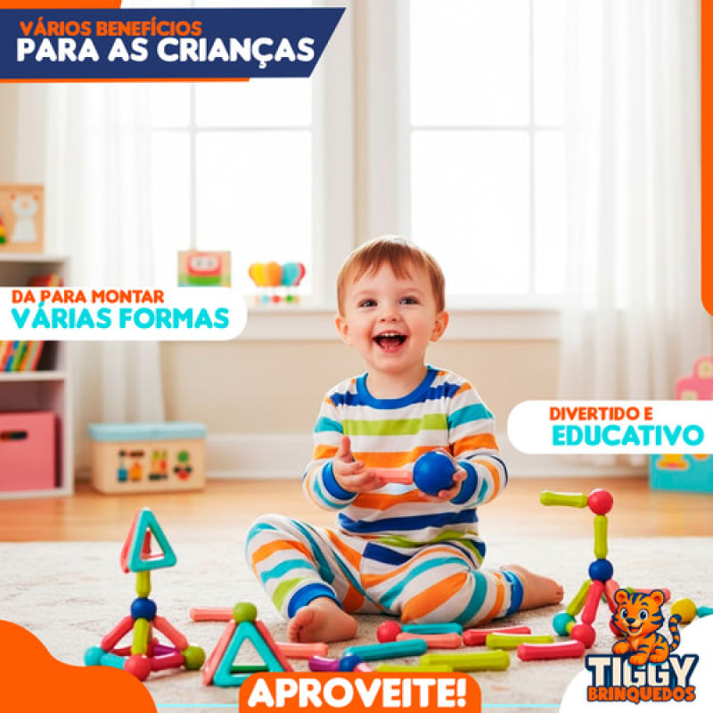 Os blocos magnéticos ajudam no desenvolvimento da coordenação motora, raciocínio lógico, criatividade e no aprendizado das formas e cores. São leves, seguros e fáceis de encaixar, tornando a brincadeira divertida e educativa ao mesmo tempo.