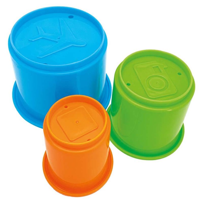 O brinquendo vem com os copinhos encaixados um dentro do outro, basta separa-los e incentivar a montagem pela criança.