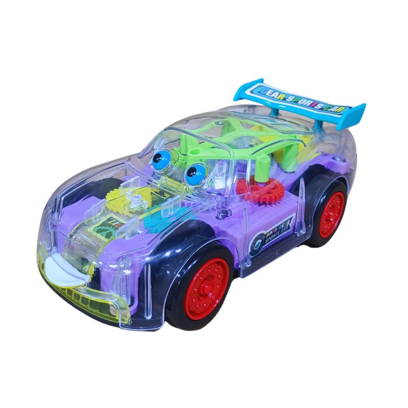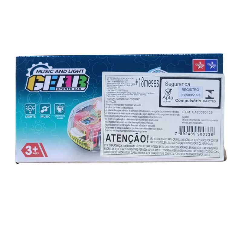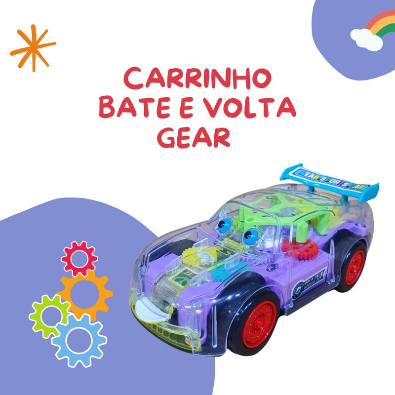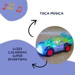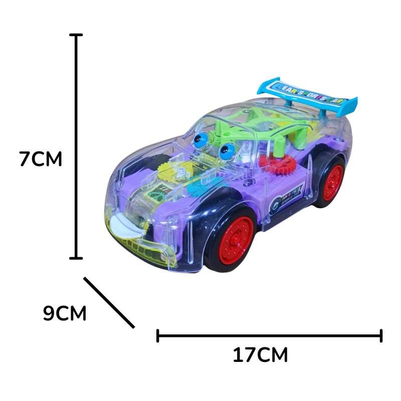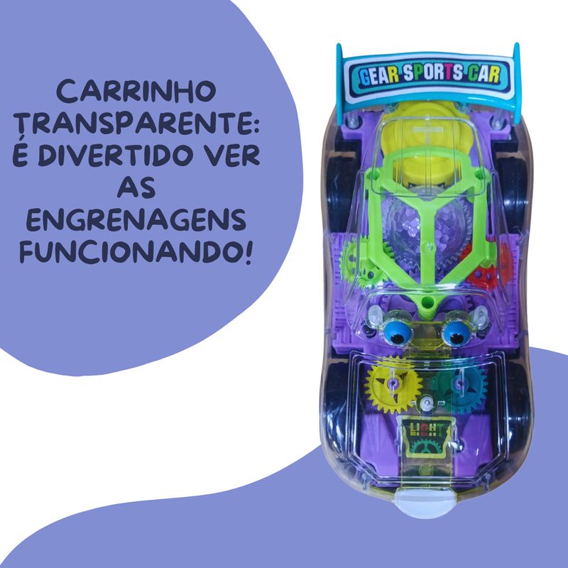 Carrinho feito de plástico transparente, com engrenagens coloridas, luzes de led e música! Estimula a curiosidade das crianças sobre o funcionamento das coisas, ajudando na sua capacidade cognitiva e de concentração; suas luzes coloridas de led deixam o carrinho ainda mais interessante, transformando em um verdadeiro espetáculo à noite; música divertida que deixa a brincadeira mais dinâmica; rodinha universal com função bate e volta, possui sensor que quando o carrinho encosta em paredes e objetos, ele dá meia volta, evitando ficar preso.