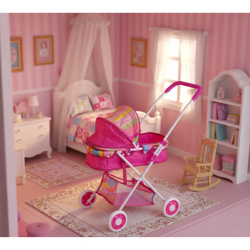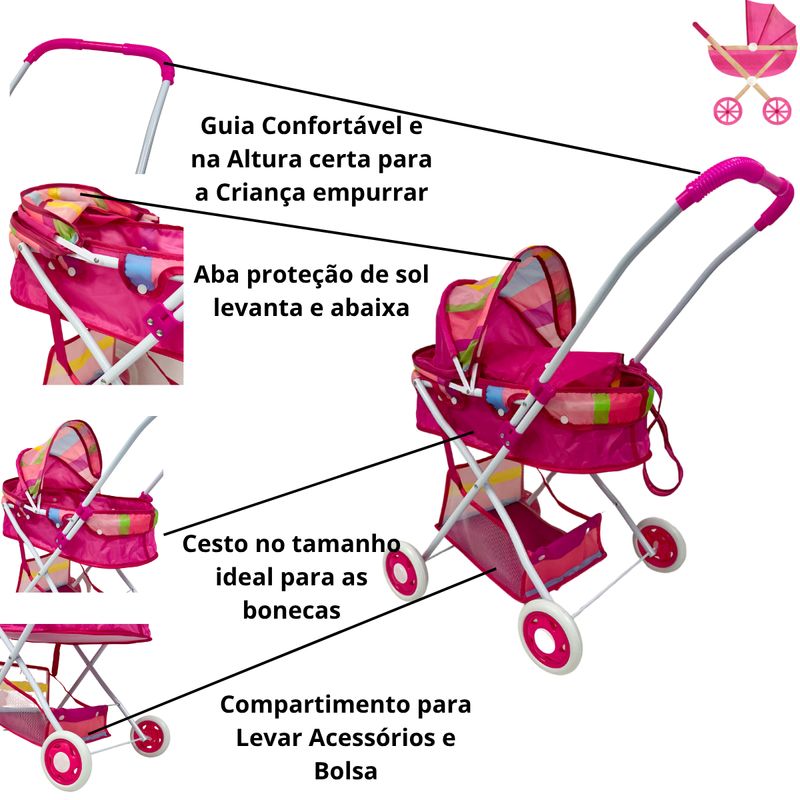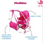 - 1 Carrinho de boneca tamanho aberto: 48 cm (C) X 35 cm (L) X 68 cm (A)