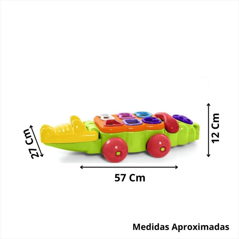 Brinquedo Infantil Jacaré Didático – Calesita O Jacaré Didático da Tateti é o brinquedo perfeito para unir aprendizado e diversão! Ideal para crianças a partir de 12 meses, ele estimula o desenvolvimento motor, cognitivo e a criatividade dos pequenos por meio de atividades interativas e coloridas. Diferenciais: Desenvolve a coordenação motora e a percepção de cores Ensina letras, números e formas com atividades didáticas Formas de encaixe que estimulam o raciocínio e a cognição Possui rodinhas e telefone com discador para brincadeiras mais divertidas Itens Inclusos: 1 Jacaré com tampa didática 6 Formas didáticas 1 Telefone 1 Língua Habilidades Desenvolvidas: Coordenação entre olhos e mãos Coordenação motora fina Compreensão de causa e efeito Curiosidade e descoberta Informações Técnicas: Marca: Calesita Modelo: Jacaré Didático Ref. 707 Idade recomendada: a partir de 12 meses Material: Plástico resistente Dimensões aproximadas: 58 cm (C) x 27 cm (L) x 10 cm (A) Peso aproximado: 700 g Certificação: CE-BRI/INNAC 02026-01A NM 300/2002 - 0061 Atenção:As cores do produto são sortidas e podem variar das imagens ilustrativas.Não é possível escolher a cor. O envio será feito conforme disponibilidade em estoque.