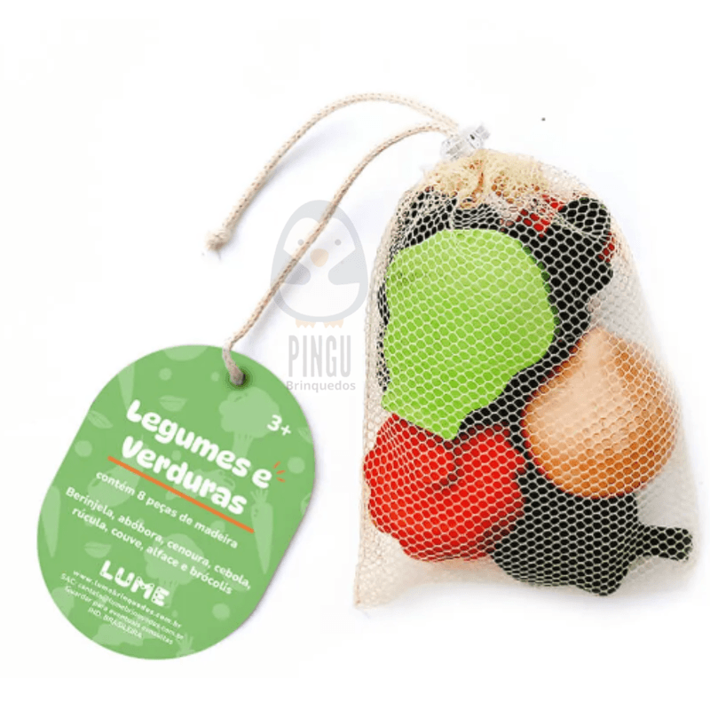 Contém: 8 peças em madeira (1 berinjela, 1 abóbora, 1 cenoura, 1 cebola, 1 rúcula, 1 couve, 1 alface e 1 brócolis).