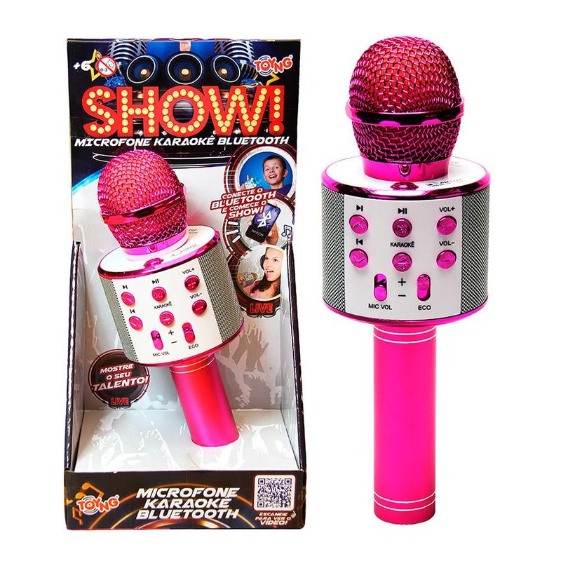 Imagine fazer um show na sua sala, no quarto ou até em uma festa com os amigos. Com o Microfone Karaokê Bluetooth Show, isso é possível, conecte-o via Bluetooth ao seu celular ou tablet e comece a cantar suas músicas favoritas em segundos. Conectividade Bluetooth: Funciona com Android e iOS, permitindo que você sincronize seu celular com facilidade. Efeitos de voz: Alterne entre vozes engraçadas ou mais profissionais com apenas um clique no botão de karaokê. Ajuste de eco: Dê aquele toque especial à sua voz com o efeito de eco ajustável. Entradas USB e SD: Além de Bluetooth, você pode usar um pendrive ou cartão de memória para tocar suas músicas favoritas. Diversão para todas as idades: Seja para crianças ou adultos, todos podem se divertir com esse karaokê portátil. O design é super intuitivo! Basta conectar ao seu celular via Bluetooth, escolher sua música e começar a cantar. Simples assim! O Microfone Show é perfeito para qualquer ocasião: festas, reuniões familiares ou até para praticar suas músicas favoritas no dia a dia. Potência de saída: 3WX2 Faixa de frequência: 100HZ Tamanho: 22,5 x 7,5cm Conteúdo: 1 Microfone com conexão Bluetooth Material: componentes eletrônicos INMETRO: 002968/2022 Homologado Anatel - 04034-18-11471 Alimentação: Bateria recarregável via USB (cabo incluso) Indicação: + 6 anos de idade