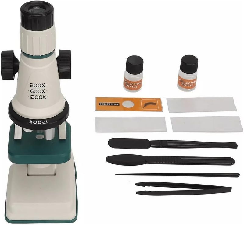 :: Conteúdo da embalagem: 01 Microscópio; 01 Espátula; 01 Pinça; 01 Perfurador; 01 Cortador de Amostras; 01 Lâmina com Amostra de Pena de Pato; 02 Frascos de Coleta; 03 Lâminas de Vidro