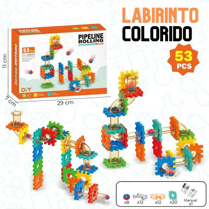 É um conjunto de 53 peças onde pode ser montado cada vez um curcuito novo pra bolinha percorrer e encantar as crianças!