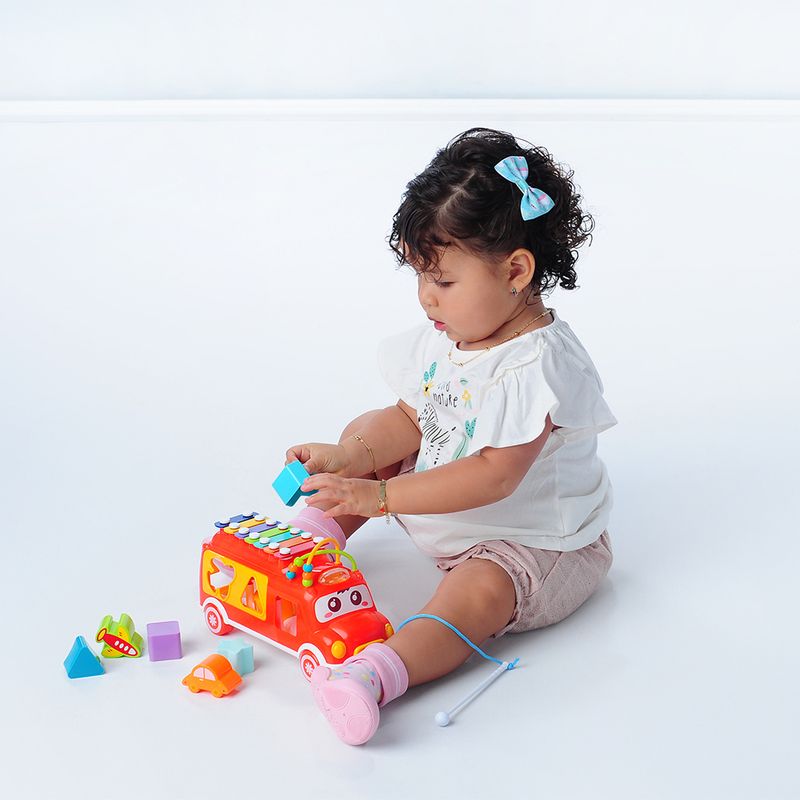 O Ônibus Xilofone com Blocos de Encaixe da Pimpolho conta com diversas funções para entreter e contribuir com o desenvolvimento visual, auditivo, motor e cognitivo dos pequenos enquanto eles aprendem a reconhecer formas, cores e notas musicais. Depois de encaixar todas as formas basta abrir a portinha lateral e traseira para retirar as peças e recomeçar a brincadeira!