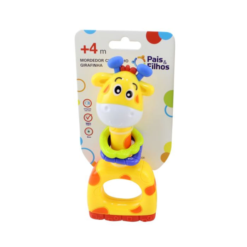 O mordedor chocalho da Pais e Filhos é fabricado em plástico rígido de altíssima qualidade para garantir durabilidade e resistência durante seu uso, sendo atóxico, lavável e livre de BPA, para cuidar especialmente de seu bebê. Em cores super alegres, esse divertido chocalho mordedor com formato de girafinha possui em cima da sua cabeça chifrinhos super macios para estimular o crescimento dos primeiros dentinhos e anéis em volta do pescoço que oferecem entreterimento para chamar a atenção dos pequenos estimulando a audição, tato e visão. O chocalho é perfeito para garantir deliciosos momentos de descontração e alegria. Características: - Conteúdo da Embalagem: Não informado- Marca: Pais & Filhos- Modelo: 4017- Dimensões da Embalagem: 17,5cm, 8,5cm, 4cm- Código de Barras: 7896647040171- Certificação: INMETRO Recomendado para maiores de 4 meses. Importante: - Nossos produtos encontram-se em estoque- Todos os produtos são lacrados- Produtos acompanham nota-fiscal e garantia