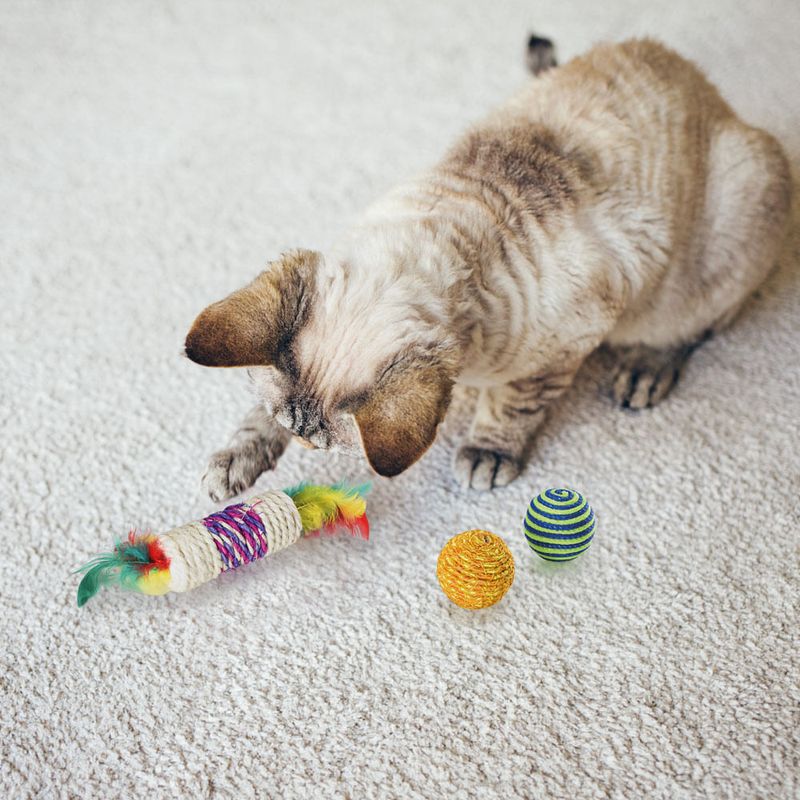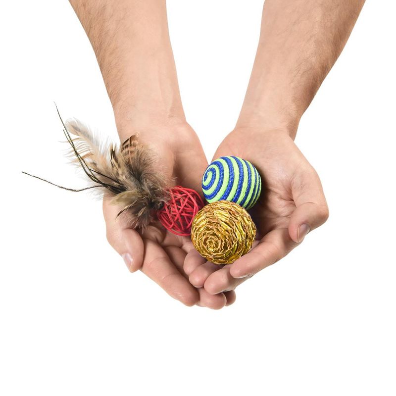 O Conjunto Bolinhas é composto por 3 peças diferentes para animar a brincadeira. Os materiais são distintos entre si, de alta qualidade e não agridem o seu pet. As diferentes texturas despertam o interesse e incentivam os bichanos a brincar.
