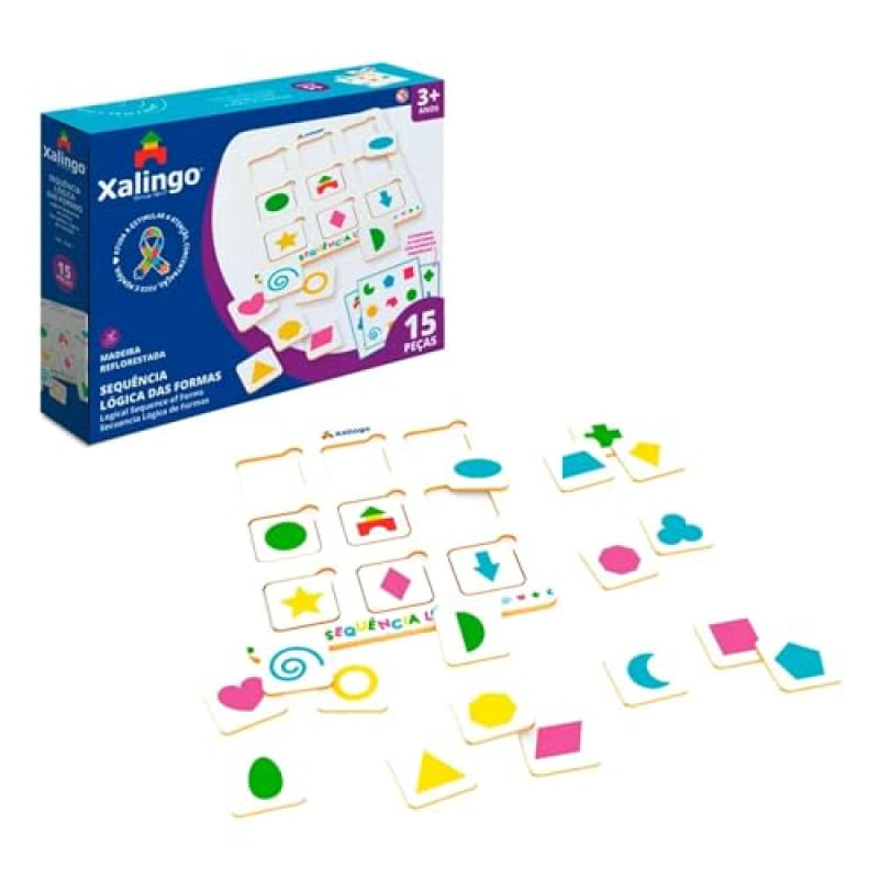 O jogo Sequencia Logica das Formas Xalingo sao 15 pecas e 24 cartinhas de desafios. Possibilita desenvolver a atencao, a coordenacao motora, a percepcao visual, a associacao de ideias, o pensamento logico e a nocao espacial. Indicado para criancas a partir dos 3 anos de idade.