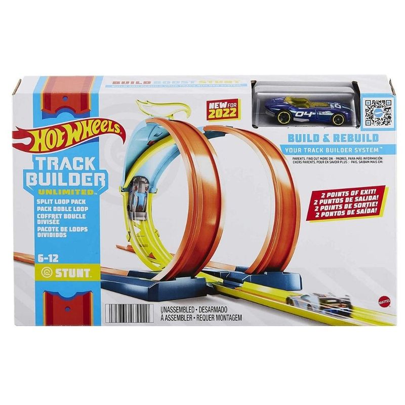- O pacote ilimitado de tiras divididas Hot Wheels Track Builder permite que as crianças escolham seus caminhos de ataque enquanto enviam seus carros Hot Wheels através de um circuito épico.