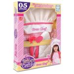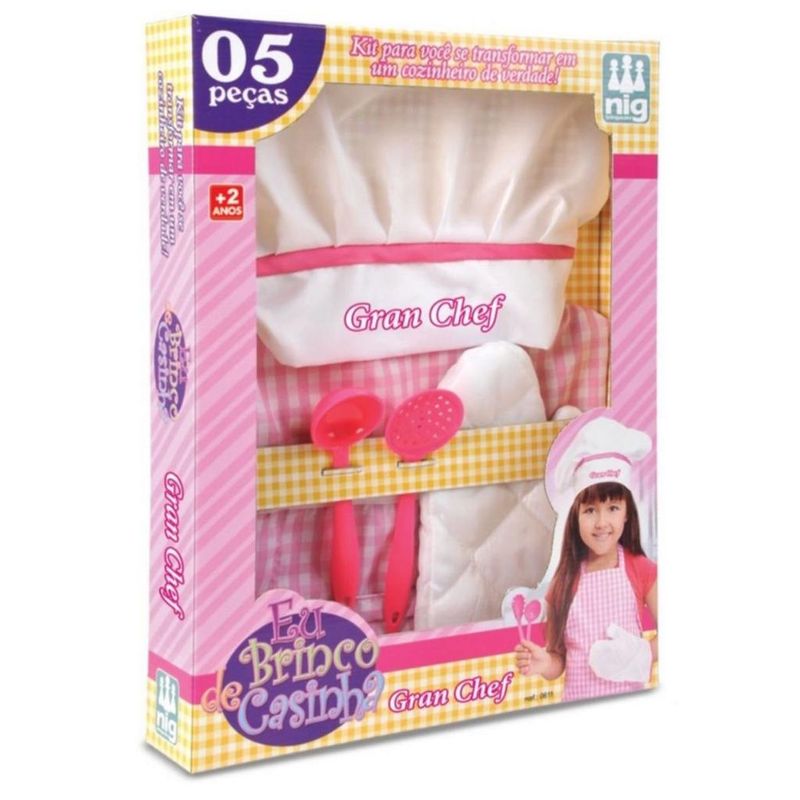 Brinquedo Grande Chef Eu Brinco de Cozinha 5 Peças Vista-se como uma grande Chef de cozinha. Este kit acessórios conta com 5 peças sendo elas um Chapeu de Chef, avental, luva e dois utensilios. São 5 peças sendo predominantes na cor Rosa e com composição em plástico de qualidade. As meninas querem ir para a cozinha com a mamãe. Elas vão adorar este conjunto de mini chef com: - 01 avental; - 01 chapéu de cozinheiro; - 01 luva; - 02 talheres grandes de plástico; Perfeito para as crianças se sentirem grandes chefes de cozinha. kit de vestimentas de um chef cozinheiro para se vestir a caráter com chapéu e luvas. Informações Gerais: Marca: Nig Brinquedos Composição: Plástico Rosa 05 Peças: Roupinha e 2 acessórios utensilios de cozinha Embalagem: Altura 7 cm x Largura 32 cm x Comprimento 40 cm x Peso: 0,315g