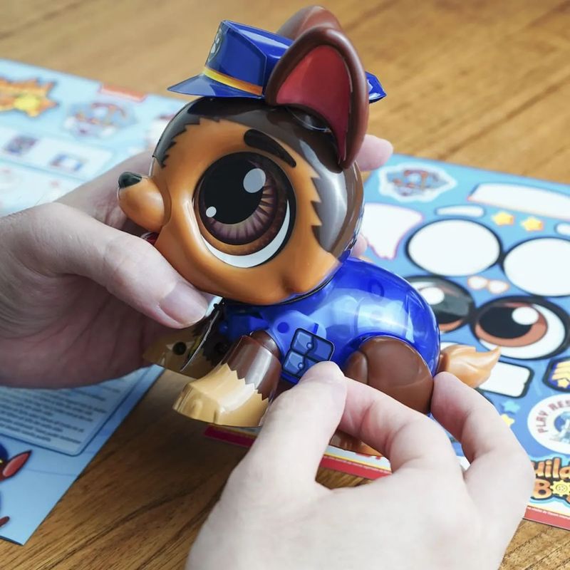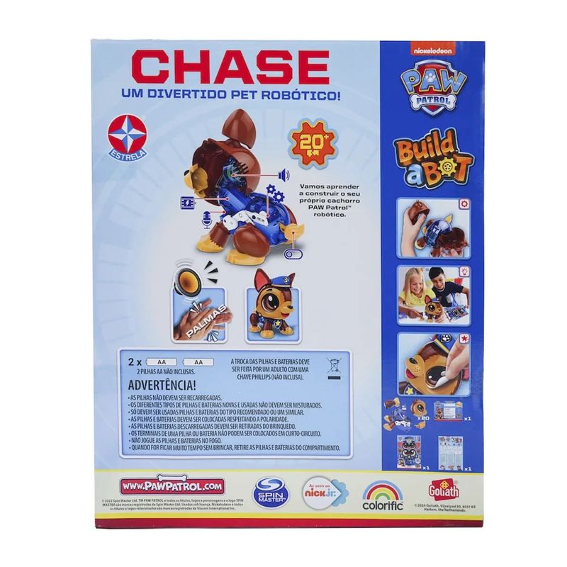 Crie seu próprio Robô da Patrulha Canina! Com muita diversão trazemos a patrulha canina! Brinque com o Chase um dos principais personagens do desenho. Junte as peças e cole os adesivos para construir o robô Chase. O cachorro vem desmontado em cerca de 20 peças plásticas e com eletrônica, sendo parte da importante da brincadeira montar o seu amigo robô. Adicione 2 pilhas AA (não incluídas) e interaja com o robô.Quando montado, ele obedece movimentos acionados por palmas ou por toques no rabinho, falando frases icônicas de seu personagem e pulando!Para acionar seu Build a Bot bata palmas ou de toques no rabinho dele e veja ele se movimentando sozinho e falando frases da série Patrulha Canina! Agora você e seu Build a Bot estão prontos para salvar o dia!O brinquedo também é customizavel, vindo com uma cartela de adesivos para a criança decorar como quiser.Peças: