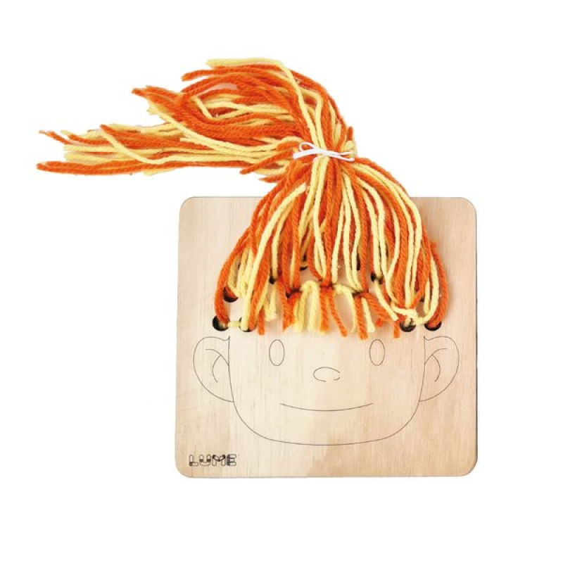 Vem com um quadrinho de madeira, no qual a criança pode fazer cabelos e penteados com lãs, fita e elementos da natureza. Após criar, ela pode pendurar o quadrinho na parede e ir mudando o penteado conforme sua vontade.