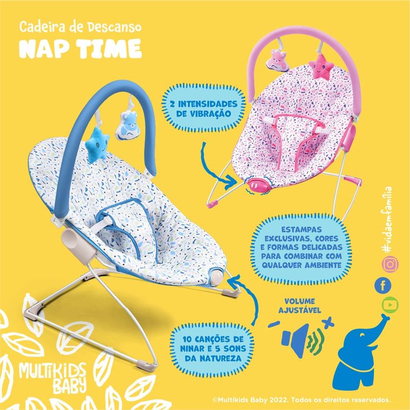 A cadeira de descanso Nap Time é apropriada para crianças desde o nascimento até os 11 kg. Seu estofado macio e delicado tem estampa com cores e formas que vão combinar facilmente com os ambientes da casa. Conta com uma barra para sustentar os dois brinquedos também macios e delicados e que vão entreter seu bebê. Com um centro de controle com 2 intensidades de vibração, 10 canções de ninar, 5 sons da natureza e volume ajustável você pode escolher o melhor momento de relaxar ou estimular o pequeno. E, como todos os produtos Multikids Baby, a cadeira Nap Time não deixa a segurança pra lá: seu cinto de segurança de 3 pontos deixa o bebê fixo e seguro na cadeira, bem guardadinho, deixando você tranquilo!