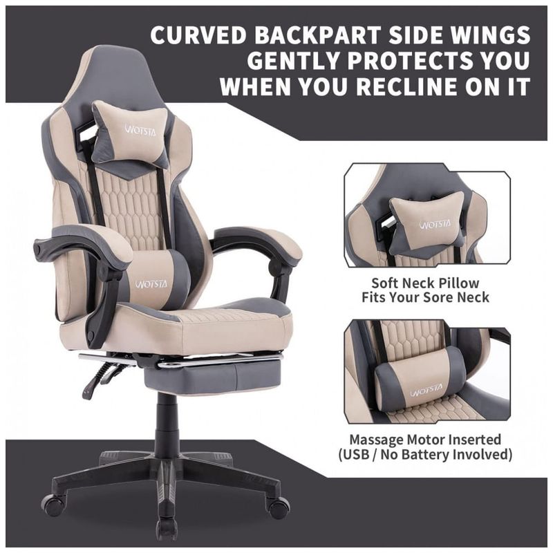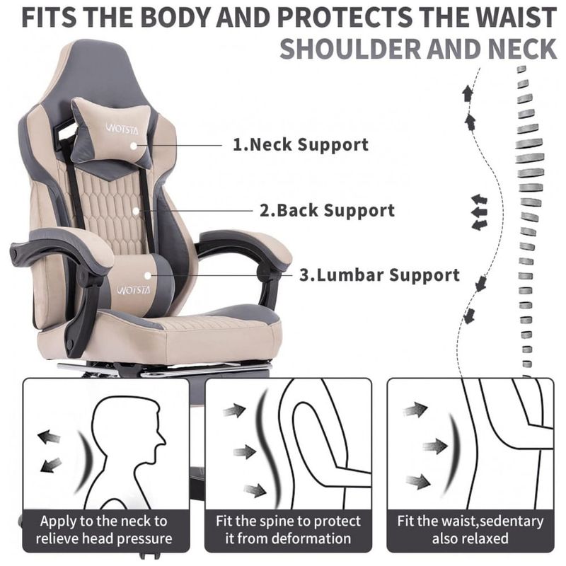 MATERIAL DE ALTA QUALIDADE Nossa cadeira de jogos com encosto alto é densamente acolchoada para o máximo conforto e couro PU premium, esponja e estrutura de aço espessa, esteja você gastando no escritório ou jogando no computador. a cadeira está equipada com apoio lombar livremente ajustável e uma almofada de apoio de cabeça para proteger a coluna e o pescoço,