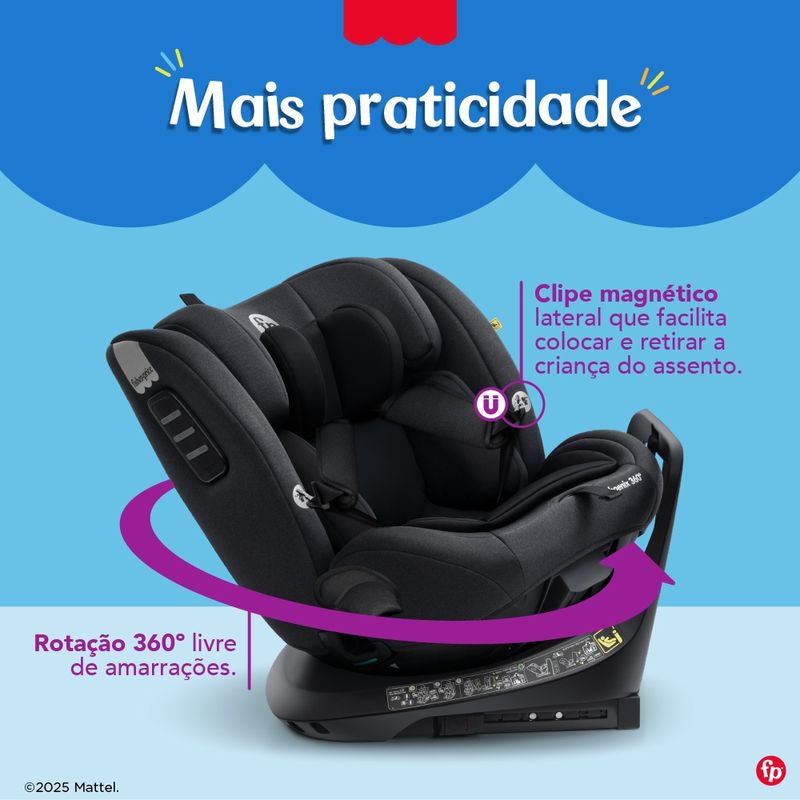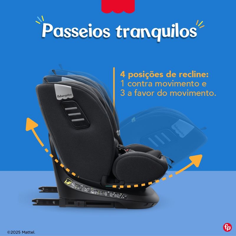 Cadeira Phoenix 360º | Fisher-Price A Cadeira Phoenix 360º é um dispositivo de retenção infantil desenvolvido seguindo a norma i-Size (R129), que representa a mais avançada tecnologia de segurança para cadeiras automotivas. A norma i-Size foi criada para simplificar a escolha correta da cadeira e proporcionar mais proteção para as crianças em caso de impacto. Diferente da classificação tradicional, que se baseia apenas no peso, a i-Size utiliza a altura da criança como critério principal para definir a compatibilidade com o dispositivo. Isso permite uma adaptação mais precisa e progressiva ao crescimento infantil, além de reduzir erros na instalação, pois todas as cadeiras i-Size utilizam o sistema ISOFIX. Uma única cadeira para todas as etapas da infância, a Phoenix 360º é certificada pela norma i-Size para crianças com estatura a partir de 40cm até 150cm, isto é, de recém nascidos até aproximadamente 12 anos de idade. Equipada com top tether na base, que permite giro 360° livre de amarrações e clipes magnéticos laterais que seguram as linguetas do cinto de segurança ao colocar e retirar a criança do assento, garantindo praticidade real. Com estofado e almofada redutora super acolchoados e macios, a Phoenix 360º garante bem-estar em todas as viagens. i-Size 40cm até 150cm Sistema de fixação ISOFIX + Top Tether Sistema de proteção contra impactos laterais Rotação 360º livre de amarrações Clipe magnético lateral que facilita a colocação e retirada da criança do assento 4 posições de recline, sendo 1 na posição contra movimento e 3 na posição a favor do movimento 17 opções de ajuste o encosto de cabeça Ajuste automático do cinto de segurança de 5 pontos Completamente coberta por capa lavável Estofado e redutores super acolchoados e macios Cadeira Phoenix 360º - Tecnologia, Segurança e Praticidade para cada jornada.