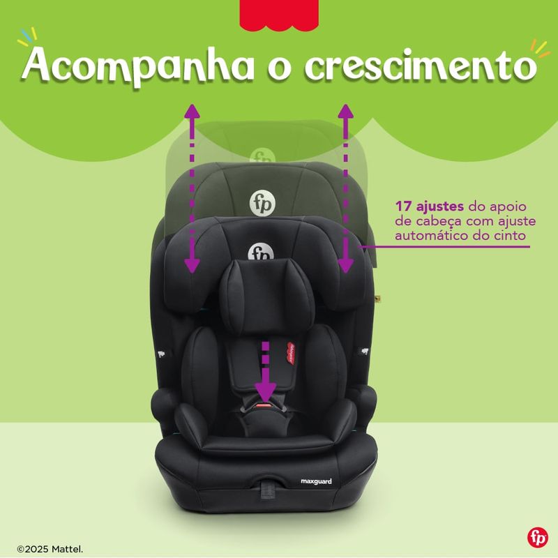 Com 14 posições de ajuste do encosto de cabeça e ajuste automático do cinto de 5 pontos, a MaxGuard se adapta a cada fase com ergonomia e praticidade. A capa é totalmente lavável, garantindo higiene e facilidade de manutenção.