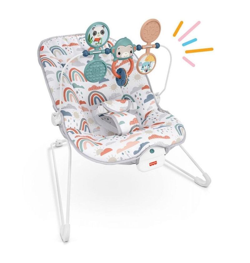 A Cadeirinha Diversão no Arco-íris Fisher-Price não restringe os movimentos do bebê. A Cadeirinha Diversão no Arco-íris Fisher-Price balança de forma suave junto com os movimentos do seu pequeno e conta com vibrações que acalmam, basta tocar um botão. A barra de brinquedos é perfeita para brincar e vem com três brinquedos em formato de animais que chacoalham e giram para garantir a diversão! Use a partir do nascimento até o bebê tentar sentar sozinho ou atingir 9 kg, o que acontecer primeiro.