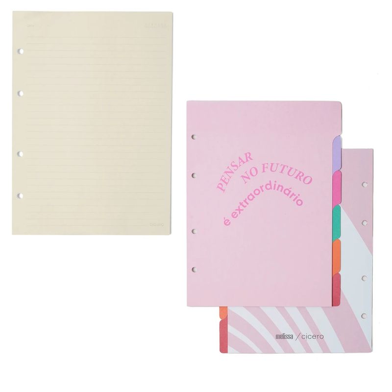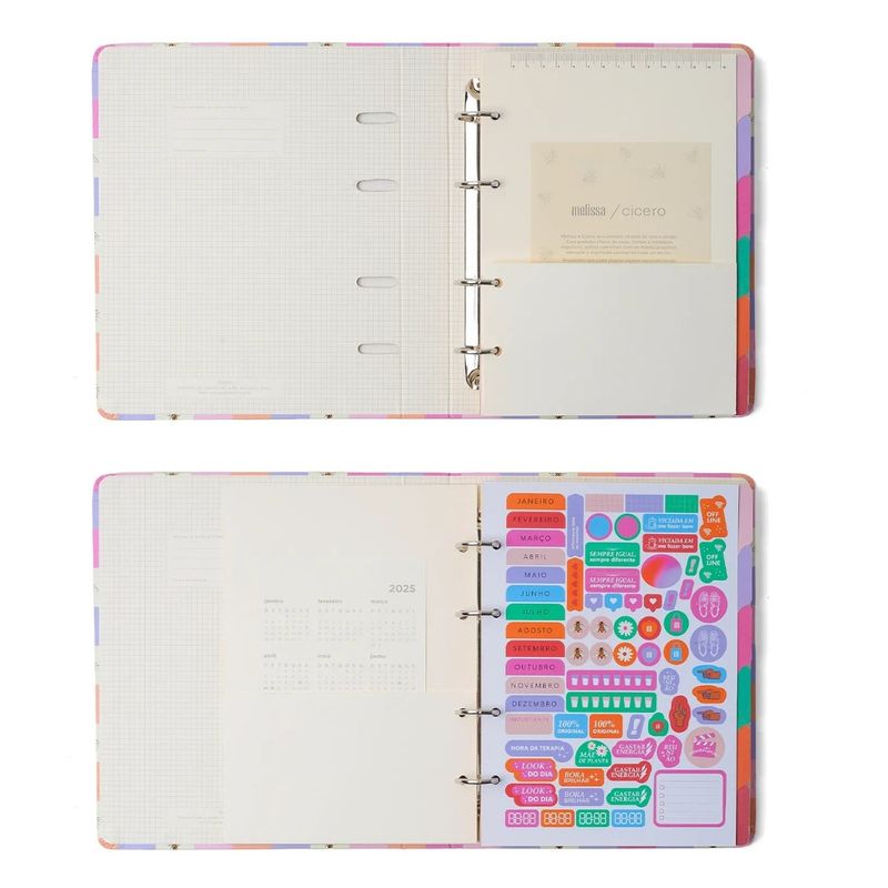 O Caderno Criativo Argolado Melissa é um fichário com 4 furos e um elástico de segurança, com estampas exclusivas criadas pela Cicero Papelaria para sua rotina ficar sempre cheia de estilo, super organizada e perfumada com cheirinho nostalgico de Melissa.